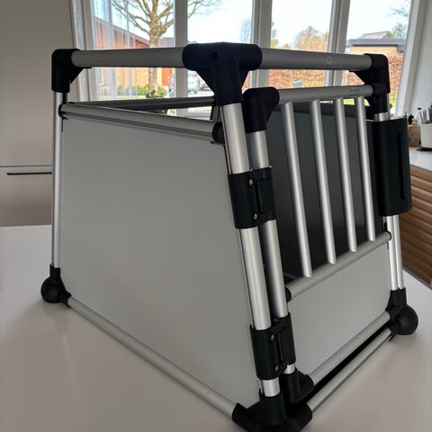 Konstruktionen består af aluminiumsstænger og faste sideplader. Foran er der låge med tremmer. Bunden har skridsikker overflade, som giver hunden bedre stå- og liggekomfort.
