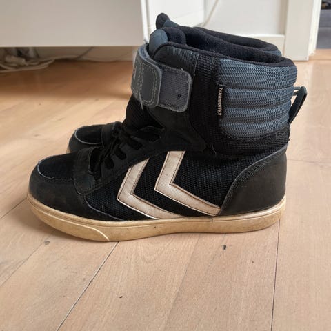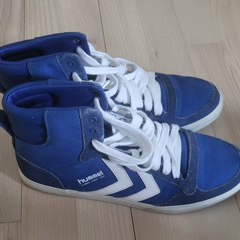 Hummel sneakers i størrelse 41. Højskaftet model i sort med blå og røde detaljer samt hvid sål.