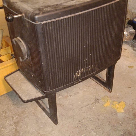 Ukendt mærke gammel støbejerns brændeovn i brunlig farve. Ovnen har to låger foran med dekorerede detaljer og et rundt komfurhul med ringe i toppen. Materialet fremstår som massivt støbejern med synlige brugsspor og patina. Skal afhentes på Frb