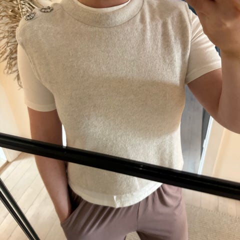 Bredde fra ærmegab til ærmegab ca 35 cm og kan stretches til ca 50 cm