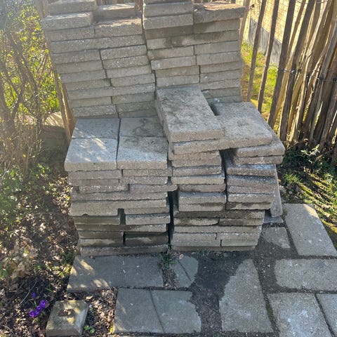 Grå betonfliser velegnet som udendørs belægningssten. Fliserne ligger stablet på paller og fremstår i forskellige stakke. Kan anvendes til eksempelvis terrasse, gangarealer, indkørsel eller andre belægningsopgaver i haven eller omkring huset. Materialet er beton i grå nuance, egnet til udendørs brug.