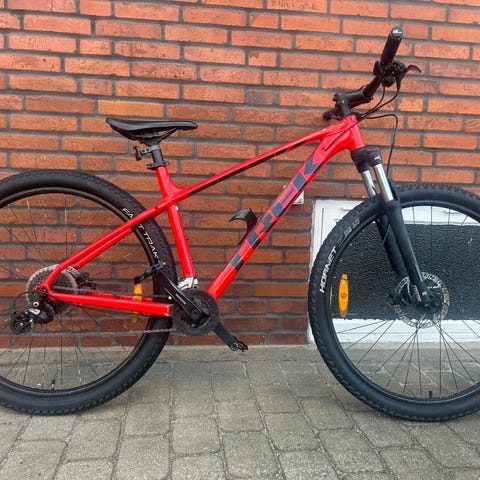 Trek Marlin mountainbike til unisex med XL stel og 29" hjul. Cyklen har rød aluminiumsramme med sorte detaljer og brede dæk, der egner sig til både skovsti og hverdagskørsel. Udstyret med fladt styr, skivebremser og standard pedalsæt. Stelstørrelse XL er velegnet til høje ryttere, og 29" hjul giver god stabilitet og rul på ujævnt underlag.