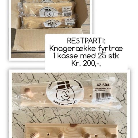Knagerække, Scandinavia, Fra ophør: Knagerække i lys træ med 5 knage (6x49x5høj) - , ialt 16 kartoner med 30 stk i hver (480 stk.) vejl. 24,60 pr stk. sælges gerne samlet til 2000 kr. eller i mindre antal til 200 kr. pr. kasse med 30 stk.- henv. 40426818