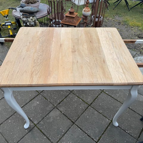 142 x 100 cm. H 75 cm. Der medfølger 2 plader som er 41 cm - dvs. max. længde kan blive 224 cm. Der kan fint sidde 6 omkring bordet uden pladerne i.