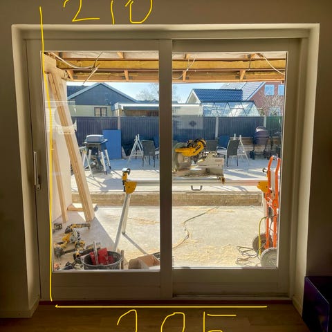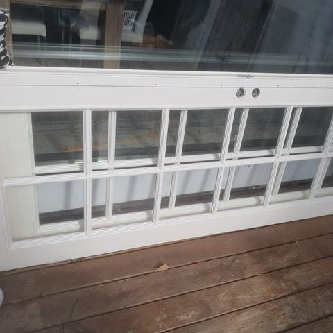 Fransk dør/ skydedør / Glasdør i hvidmalet træ med flere glasfelter. Døren har udskæringer til dørgreb og lås. Dørene har hængt i et sommerhus som vi overtog sidste år. Der er tre stykker.