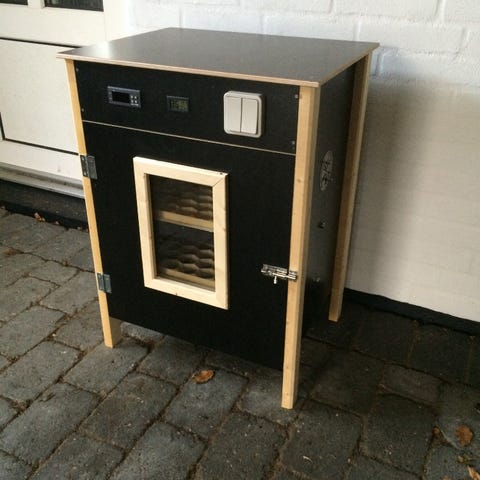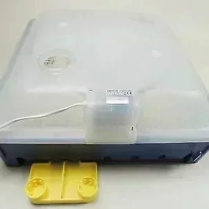 Inkubator ægklækker i plast med elektronisk betjeningspanel på toppen. Enheden har gennemsigtige sider og gule bakker til æg. Kabinettet er rektangulært med cirka-mål 49,8 x 47,3 x 39 cm. Egnet til rugning og klækning af æg fra fjerkræ i mindre besætninger eller hobbybrug. Elektrisk tilslutning via netkabel i siden af kontrolpanelet.