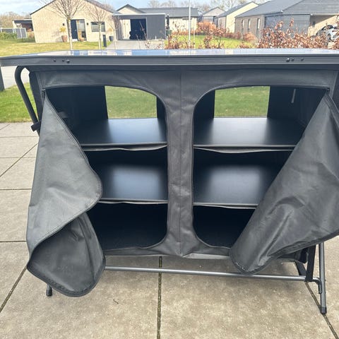 Campingskab med 4 hylder. Plads til gasflaske.