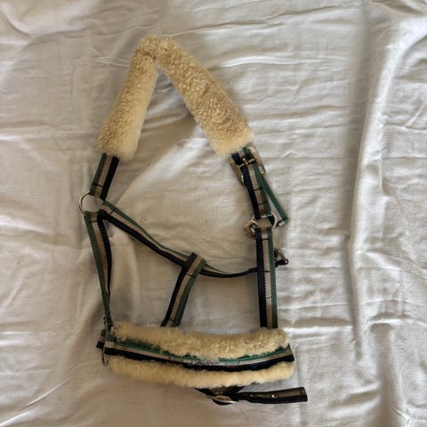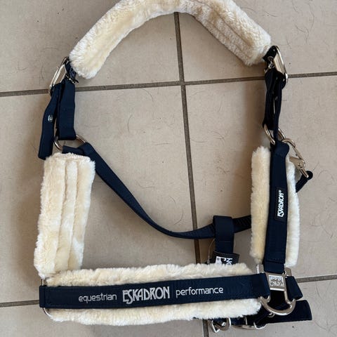 Eskadron Safety grime i sort. Grimen er udstyret med sikkerhedslukning og justerbare remme. Egnet til brug i stald, fold og ved håndtering af hest, hvor der ønskes ekstra sikkerhed ved fastgørelse og løsgørelse.