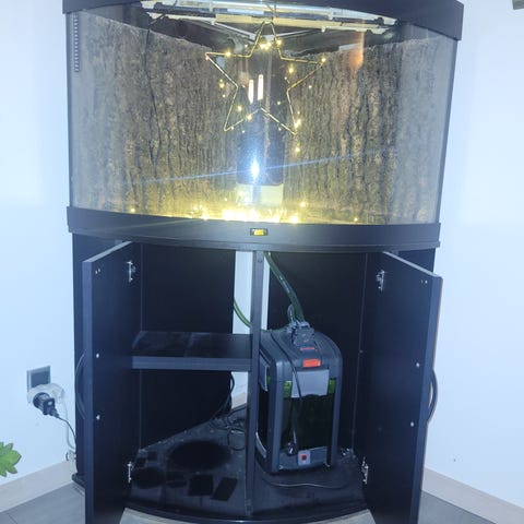 Mener det er et Juwel akvarium. Naturligt LED lys, Eheim spandpumpe med filter i hjørnet af akvariet. Store sten og et par mallehuler kan medfølge. Flyet er ikke til salg.