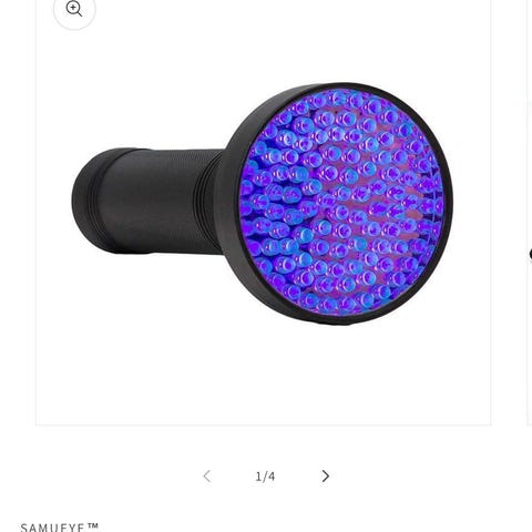 Samueye UVA100 UV lommelygte med kraftigt UVA-lys. Lommelygten har et stort lampehoved med mange LED-dioder, der udsender ultraviolet lys. Velegnet til opgaver, hvor der er behov for UV-belysning, f.eks. inspektion eller markering, hvor UV-lys er påkrævet. Leveres med original emballage, som angiver UV-advarsler samt certificeringer som FCC, CE og RoHS. Kan bruges som ravlygte. Bruger 6x AA-bstterier - medfølger ikke.