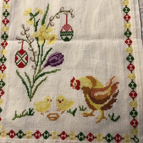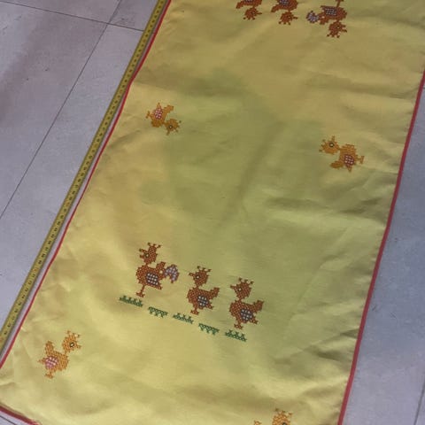 Påske løber sæt bestående af tre hvide duge/løbere med broderede motiver. Motiverne omfatter påskeliljer, forårsblomster og kyllinger i gule og grønne nuancer. Løberne har forskellige aflange og ovale former og kan anvendes på spisebord, sofabord eller skænk som påskepynt. Velegnet til indendørs brug i påskesæsonen. Pris pr. stk 25 kr.
