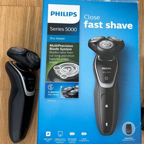 Elektrisk barbermaskine med tre roterende skærhoveder og ergonomisk håndtag. Velegnet til daglig barbering og til følsom hud. Leveres med opladelig enhed og kan bruges til tørbarbering. På emballagen ses også en Philips rense- eller plejeproduktflaske, som kan være beregnet til brug sammen med barbermaskinen, til vedligeholdelse af skær.