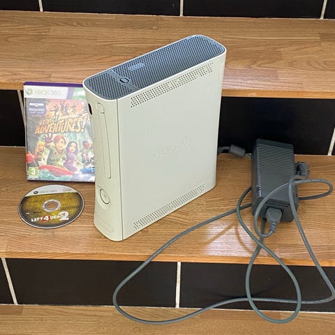 Konsollen er en Xbox 360 model i hvid. På billederne ses blandt andet strømforsyning, forskellige tilslutningskabler, to trådløse controllere samt mindre adaptere/tilbehørsdele.