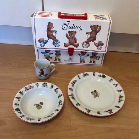 Royal Copenhagen Julius børneservice tallerkensæt i porcelæn. Sættet består af en flad tallerken og en dyb tallerken med Julius-bjørn motiv hele vejen rundt langs kanten og i midten.