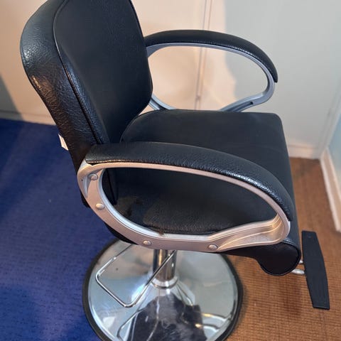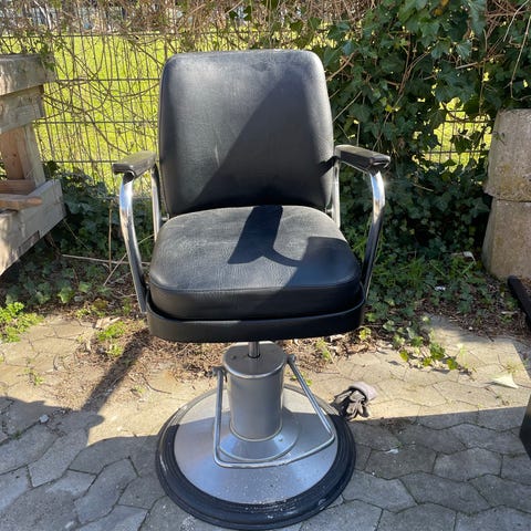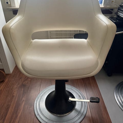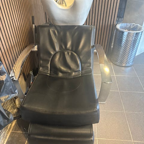 Salon vaskestol med beige polstring, armlæn i metal og en hvid vask til hårvask. Vaskestolen har en sort base og er designet til brug i frisørsaloner. D. ca. 120, B 58, H 100. 1 stk haves. Pris pr stk