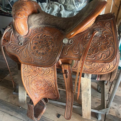 Circle Y westernsadel i brunt læder med udskåret mønster. Sadel med horn, dybe sædekanter og dekorative detaljer på klapper og forkant. Udstyret med stigremme og stigbøjler i læder samt metalringe til fastgørelse af udstyr. Der følger også et originalt forstykke i læder med udskæringer med, samt en original gjord. Velegnet til westernridning og trailridning.