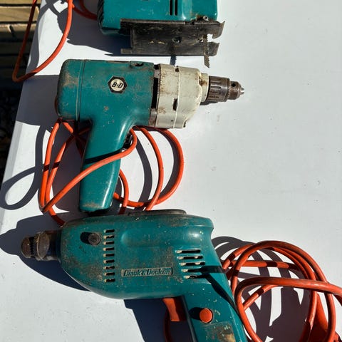 Blandet parti elværktøj bestående af flere forskellige maskiner til værksteds- og gør‑det‑selv‑opgaver. Partiet omfatter en elektrisk boremaskine med sidehåndtag, en pneumatisk sømpistol til F50 søm, en elektrisk stiksav, en elektrisk varmepistol samt en borehammer med sidehåndtag. Alle maskiner er ledningsdrevne, bortset fra sømpistolen som tilsluttes trykluft. Velegnet til almindelige bore-, save-, søm- og varmeopgaver i hjemmet eller værkstedet, afhængigt af de enkelte maskiners specifikationer og tilstand.