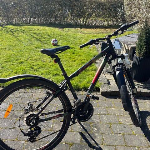 X-Zite X-375 børnecykel med 26" hjul. Cyklen har sort stel med blå og grønne detaljer. Udstyret med flade styr, gear og håndbremser for og bag. Der er monteret skærme og støtteben. Velegnet som cykel til større børn eller unge med 26" hjulstørrelse.