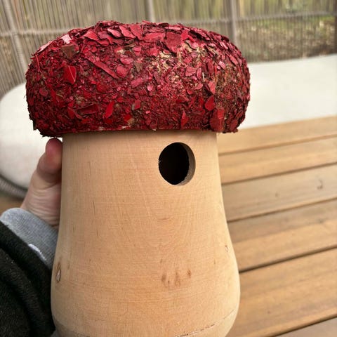 Der er lavet huller til at den enten kan sættes op med skrue igennem bagbeklædningen eller hvis man ønsker at binde den op med reb i siderne. 🪵🐦