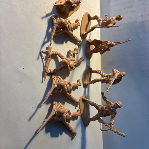 Plastik soldater legetøjsfigurer i beige farve. Sættet består af flere små figurer i forskellige stillinger, velegnet som legetøj, samlerobjekter eller til dekoration. Figurerne er fremstillet i hård plast. 3 cm.