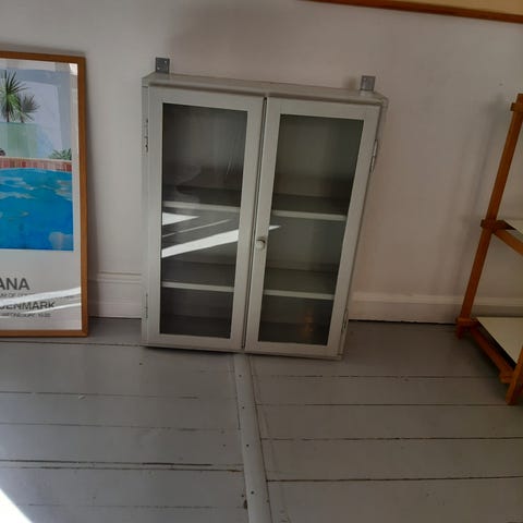Fint vitrineskab til ophæng. Med glaslåge. Malet i fin stil.