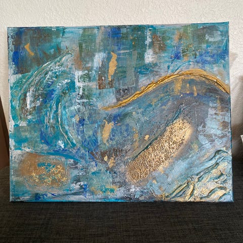 Abstrakt maleri på lærred i blå og turkise nuancer med detaljer i guld og lilla.