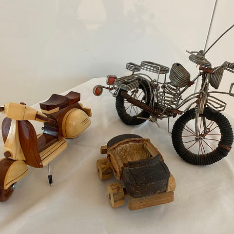 Træ model tuk tuk miniatur køretøj i naturfarvet træ. Håndlavet udseende med detaljeret kabine, sæder og tag. Modellen har tre hjul og åbne sider, som kendetegner en tuk tuk eller autorickshaw. Egnet som dekoration, samlerobjekt eller legetøjsmodel til ældre børn, da den består af faste trædele uden bevægelige funktioner synlige på billederne.