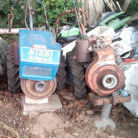 Ældre Nibbi med meget tilbehør. Mener den er 14,5hk. Tromle, fræser, vogn, sneslynge, harve og plov. Den ku køre da den kom i laden men nu vil den ikke starte. Den havde problemer med at komme ned i omdrejninger, et eller andet med gaskabel.