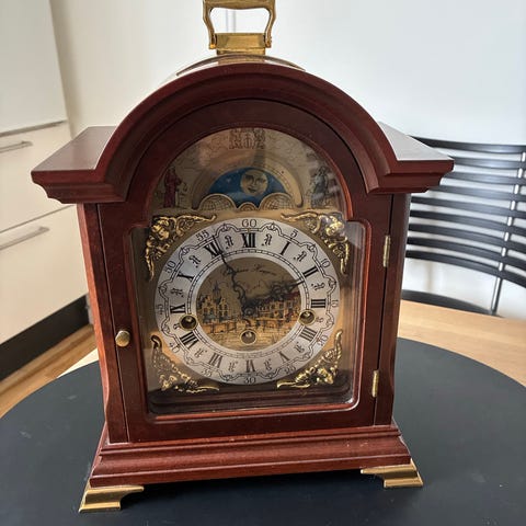 Ukendt mærke mekanisk stueur i træ i brun farve. Uret har rektangulært kabinet i træ med glaslåge foran. Skiven har romertal og dekorative detaljer omkring centrum. Nederst på fronten ses et dekoreret felt bag glas. Uret har en ophængsring på toppen, så det kan placeres både stående på en hylde eller eventuelt hænges op. Velegnet som indretningsgenstand eller til samlere af ældre mekaniske ure.