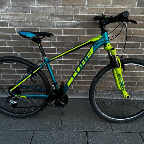 Cyklen har 27.5 tommers dæk og M stel - passer en på 160-185cm