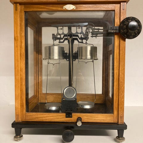vintage vejeredskab fra 19. århundrede, asiatisk medicinvægt, guitar formet trææske med inskription (metalstifter) se sidste foto, vægtstang med skala, lod og vægtskål i metal / jern , ring på æske der kan flyttes, så den låses, trææske længde 35 cm