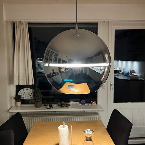 Verner Panton pendel lampe i kugleformet design. Lampen har en gennemsigtig ydre kuppel og indvendige hvide skærme i flere lag, som er typisk for Verner Panton-inspireret belysning. Velegnet som loftlampe over spisebord, i stue eller andre rum, hvor der ønskes et centralt lys og et markant, grafisk udtryk. Har papir på den og kvittering men den skal poleres derefter prisen men virker som den skal
