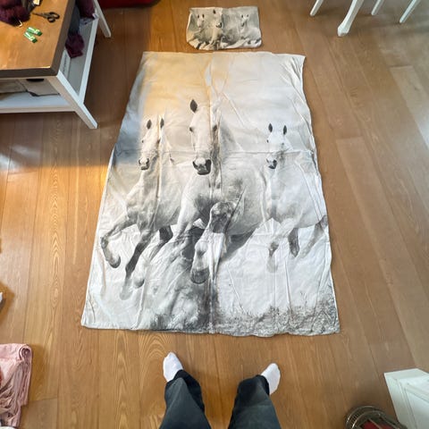 sengetøjssæt med enhjørning motiv til børn. Sættet består af dynebetræk med stort farverigt enhjørningetryk på lys baggrund samt pudebetræk med teksten "Stay Magical". Egnet til børneværelse med tema i lyse farver og fantasimotiv. Materiale fremstår som let tekstil velegnet til almindelig indendørs brug på enkeltseng.