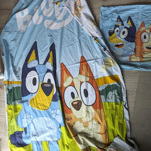 Bluey flonel sengesæt (200×140 cm). Blødt og varmt. Fin stand. Fra røg- og dyrefrit hjem.