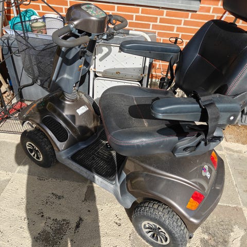 Mobilt sammenklappeligt el‑køretøj med sæde. Modellen har tre hjul, lav indstigning og et polstret sæde med ryglæn. Styret er udstyret med håndtag og kontrolpanel til betjening. Konstruktionen er kompakt og kan foldes sammen til transport eller opbevaring, som vist på billedet. Velegnet som lille el‑scooter til kortere ture på jævnt underlag.