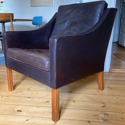 Dronningestol i brun læder. Ikke Arne Jacobsen/wegner. Stolen har polstret sæde og ryglæn med løst ryghynde og faste armlæn. Ben i træ. Egnet som enkeltstående lænestol i stue, læsehjørne eller kontor. Klassisk, enkel form med lav ryg og let buede sider. Farven fremstår som mørkebrun.