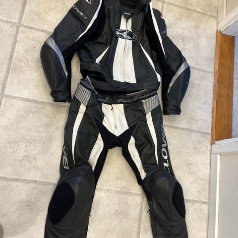 IXS læder motorcykel heldragt i str. 54. Dragten er udført i sort og grå læder med kontrastfelter og forstærkninger på skuldre, albuer, hofter og knæ. Der er integrerede strækzoner for bedre bevægelsesfrihed samt lynlåsforbindelse mellem overdel og bukser. Egnet som beskyttende køredragt til motorcykelbrug.