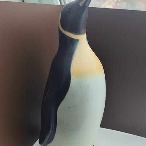 Den er så smuk og elegant Knabstrups gamle keramik pingvin sparebøsse. Denne har limet næb, men ellers i fineste stand og vil stadig pynte så flot på hylden, skrivebordet eller vindueskarmen. Nøgle, der duer, følger med. Er i tvivl om det er den originale nøgle?