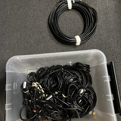 Blandet parti kabler og adaptere til elektronik. Pakken indeholder forskellige typer ledninger og kabler, herunder netværkskabel, USB‑kabler, lyd- og videokabler samt diverse strømforsyninger og adaptere. Der ses også et USB-hub og enkelte hukommelseskort i pakken. Egnede til brug med computerudstyr, netværksudstyr og andet elektronisk udstyr, hvor der er behov for forskellige forbindelsestyper. Prisen gælder samlet for hele partiet.