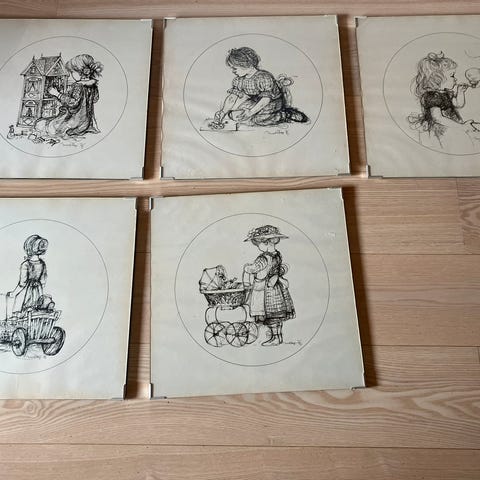 3 søde pige billeder - med tegninger af Christel. De har oprindelig siddet en en poesibog. Hvert billed måler ca. 14x19 cm, sidder i trærammer med glas. De sælges samlet.