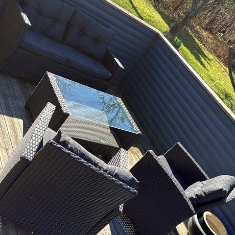 Havemøbelsæt loungesæt i flettet materiale i beige nuance med lyse hynder. Sættet består af en 3-personers sofa, to loungestole og to runde sofaborde. Benene er i mørk farve, som giver kontrast til det lyse flet. Sættet er egnet til udendørs brug på terrasse, altan eller i have som afslapningsområde. Ny pris 7499kr hyndeboks kan medfølge