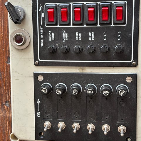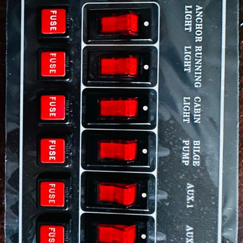 Bådpanel med flere vippekontakter og sikringsholdere til styring af elektriske funktioner ombord. Panelet har separate kontakter med tilhørende sikringer, egnet til f.eks. lanterner, læselys, pumper eller andre 12V-funktioner. Medfølgende engelsksprogede mærkater til tydelig markering af de enkelte kredsløb, herunder blandt andet running lights, bilge pump, cabin light, windshield wiper, navigation lights, search light og instruments. Bagsiden er forsynet med ledningsforbindelser klar til tilslutning i bådens elsystem.