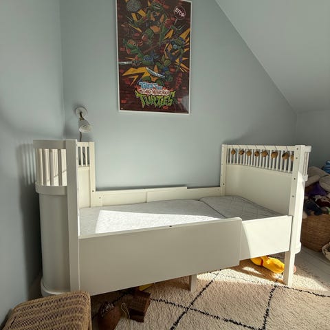 Sebra seng - Ny model hvor bunden kan hæves. Den er brugt til et barn og fremstår i rigtig pæn stand. Der kan medfølge madras og forlængerstykke. Der har altid været vådliggerlagen + almindeligt lagen på, men madrassen må forventes at trænge til en vask (betrækket kan lynes af). Lagner både små og store kan medfølge, hvis det ønskes.