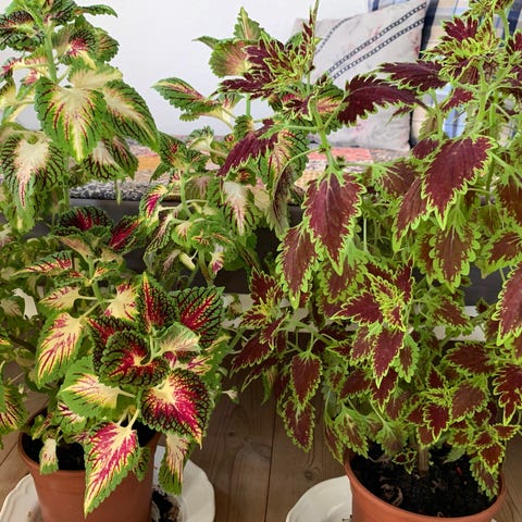 Coleus/paletblad, indendørs prydplante med flerfarvede blade i grønne og pink nuancer.