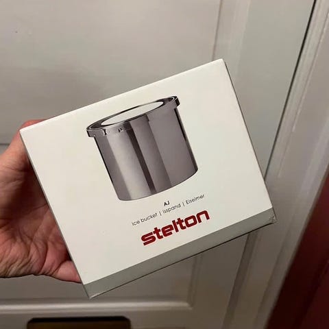 Arne Jacobsen tegnede isspanden for Stelton i 1967. Minimalistisk og tidløst design. Isspanden med låg er i dobbeltvægget rustfrit stål, der er isolerende, så isterningerne holder længere.