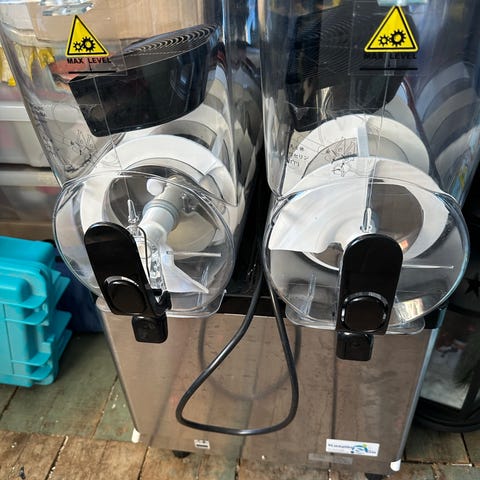 Trepko slush ice maskine i rustfrit stål med gennemsigtige beholdere. Maskinen har flere tanke til fremstilling og servering af slush ice eller frosne drikke. Beholderne er udstyret med tappehaner på fronten og indvendige roterende snegle, der holder indholdet i bevægelse. Kabinettet er udført i metal med ventilationsgitter på fronten. Velegnet til brug i café, kiosk, kantine eller andre professionelle miljøer, hvor der ønskes servering af frosne drikke.
