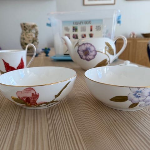 Seks kopper med underkopper, seks espresso kopper en tekande og to skåle. Brugt en enkelt gang - ingen skår eller synlige brugsspor.