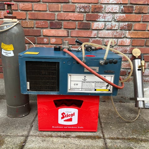 Wiibroe fadølsanlæg med tappehane og tilhørende trykregulatorer og slanger. Anlægget er beregnet til servering af fadøl fra fustager og består af en metalenhed med indbygget tappehane på fronten. Medfølgende trykregulatorer og manometre bruges til at styre trykket fra gasflaske til fustage og videre til hanen. Velegnet til brug ved arrangementer, fester eller i bar- og køkkenmiljøer, hvor der ønskes udskænkning af fadøl fra fustage.