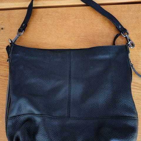 Tasken er fremstillet i sort stofmateriale og bæres med en enkelt skulderrem.
