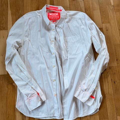 Superdry herreskjorte i størrelse XL. Skjorten er hvid. Klassisk model med lange ærmer og knaplukning foran samt knapper ved manchetterne. Egnet som hverdagsskjorte eller til mere formelle anledninger.